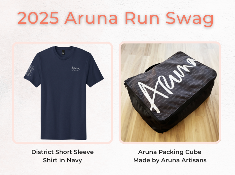 When you participate in the Aruna Run, you run or walk to help bring freedom to an enslaved woman by name. You will then receive updates on her journey to freedom throughout the year. The race giveaway items are all hand-made by freed Aruna Artisans.