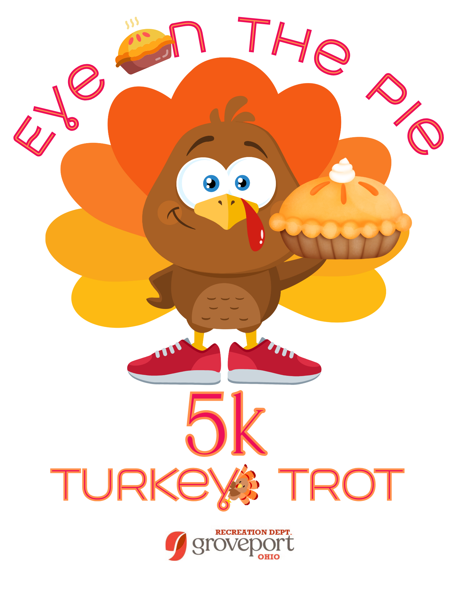 Join us the the 4th Annual Eye on the Pie 5k Turkey Trot! It is a chip-timed event held on Thanksgiving Day, Nov. 27th, in beautiful Groveport Park where runners will run 3 laps around a 1 mile course. Runners will receive a “I’m just here for the pie!” t-shirt and a whole pie of their choice – apple or pumpkin! Yummmm…. There will also be a live DJ on site this year! Come for the exercise! Come for the music and fun! But most of all, come for the pie!